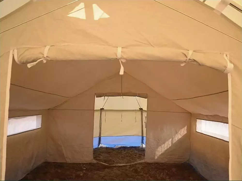 เต็นท์ด้านนอก: ผ้าฝ้ายผสมโพลีเอสเตอร์หรือผ้าเคลือบ HDPE มีคุณสมบัติป้องกัน 3 ชั้น (กันน้ำ หน่วงไฟ ทนรังสียูวี)